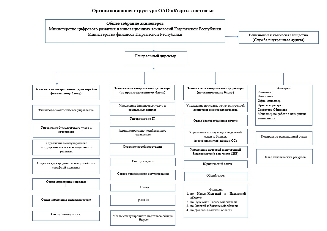 Структура: Главой ОАО «Кыргыз почтасы» является Генеральный директор. ОАО «Кыргыз почтасы» находится на самообеспечении.